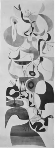In the early 1950s Deshaies made prints by a technique that he called stencil-offset, which a critic said, used "bright and unequivocal color" with strength and precision to achieve a gracefulness of forms.[11] One of these offset prints was a surprising seven feet long by seven inches wide.[33] In 1955 he described his abstractions as symbols that did not represent any entity already in existence, but rather were themselves reference points to which newly created entities might find links. He said: "To give a signification to new signs, the reinvention of signs is the measure for individual integrity. Up to now, the process of 'signification' was: a thing was given and a sign was invented for it. Now, a sign will be given; it will be valid if it finds its incarnation."[34]
