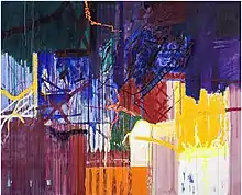 At some point during the 1970s or 1980s, Deshaies began to make mixed-media assemblages on paper and acrylic paintings on canvas [27] In 1991 Deshaies wrote that his work at that time exposed chaos rather than attempting to bring order to it. He said: "The confusion is all around us and our only chance is to let it in. The only chance is to open our eyes and see the mess."[29] In 1995 a critic said the paintings he made at this time contained highly colored lush Florida-tropical colors. He wrote that they revealed "incandescent sensations through layers of heightened colors applied to paper and canvas."[30] Two years later, describing a set of paintings called the "Universe Series," another critic noted colors that were "transparent, superimposed and incandescent."[31] An untitled painting of 2004, shown at right, is an example of his work in acrylics at this time. At the age of 80 Deshaies told an interviewer that he was an abstract impressionist.[1]
