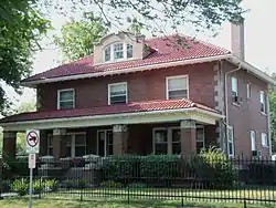 The Arthur Ebeling House is a two-story residence utilizing a rectilinear plan. It features a hipped roof covered in red clay tiles, a full-length front porch, and an entrance vestibule in the back of the house. The exterior is covered in pink-tan face-brick laid in a stretcher bond pattern.[5] The window sills, water table, and quoins are concrete slabs. The façade is symmetrical with three bays. The porch roof is supported by brick piers with concrete caps. The balustrade is solid brick and features panels with a lions' head reliefs on both sides. The main entrance is framed by sidelights.