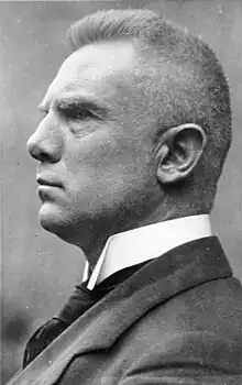 Dinter's thinking in the years after the war became steadily more radical and more racist. In 1919, he had already taken part in founding the Deutschvölkischer Schutz- und Trutzbund and was in its leadership until it was banned in 1922. Thereafter he became a founding member of the Deutsch-Völkische Freiheitspartei ("German- Peoples Freedom Party") and forged closer ties with Adolf Hitler. Dinter was elected in February 1924 to the Thuringian Landtag as a representative of the electoral alliance Völkisch-Sozialer Block ("Peoples Social Bloc"), becoming leader of its Landtag faction. However, in a dispute with other party members, he was removed as leader in July. He drew ever nearer the Nazi Party's position, and Hitler, while still in Landsberg Prison in December 1924, appointed Dinter the Nazi Party State Leader of Thuringia. Thuringia was the only German State that had not banned the Nazi Party after the Beer Hall Putsch in Munich in 1923.[1] At the same time, Dinter became publisher of the newspaper Der Nationalsozialist, which appeared in Weimar. He fell out with his former associates from the VSB, leading to his expulsion from that party in December 1924. In February 1925, after Hitler had been released early from prison, the Nazi Party was re-founded after having been disbanded after the débâcle in Munich. For his "loyalty" to the Party, Dinter received the single-digit membership number "5", when re-enrolled in April 1925. On 6 April 1925 Hitler officially appointed him Landesleiter, later redesignated Gauleiter, of Thuringia.[2]