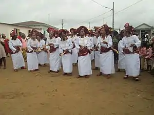 Ayodele Olukoju, a Nigerian economic historian, believes aso ebi became a novelty in 1920 during a period of post-World War I economic boom[3] triggered by the higher prices for products such as oil palm. William Bascom traced the origin to an earlier period when members of Yoruba age grades wore uniform dressing to mark fraternal bonds.[4][5] In the 1950s, members of women's organizations or egbes turned out to ceremonies and anniversaries of relatives in the same style of dress, sandals, lappa, smock, or necklace; the culture signifies close friendship. The uniform dressing can also be a measure of personal affluence, because aso ebi involves rivalry between various egbes or groups with each group competing to outshine each other in terms of quality, originality and richness of the uniform.[6]