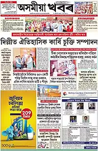 Asomiya Khabar (Assamese: অসমীয়া খবৰ) (or Oxomiya Khobor) is an Assamese daily newspaper published simultaneously from Guwahati and Jorhat.[1] It is one of the highest circulated Assamese daily newspaper. A weekly supplement named Deoboriya Khabar is published with it on every Sunday. It was placed as the second largest vernacular daily of the region.[2] Veteran journalist Shankar Laskar is in the position of editor of Asomiya Khabar and Biswajit Das is the executive editor.[3]