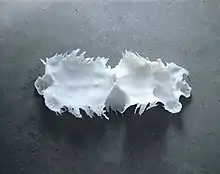Gröting's earlier work focused on sculpture, before she also turned to video and performance, starting 1993.[3] Gröting's works often present ordinary, familiar elements, where the viewer's attention is drawn towards their material transformation, caused by the exaggeration of the familiar. In Gröting's work there is a focus on what is not visible, like the inner voice, the space between lovers having sex, the digestive system, or the inside of holes made by bullets, and the ways in which the invisible can be brought to the surface. As such, she allows absence to do the talking. In these explorations a sense of realism is at work that pays attention to what is not considered to be beautiful, or to what is seen as damaged or even damaging. It develops works that convert psychological and emotional perspectives to the complex relationships of people into clear forms. Often they are presented in work groups or series.[4]