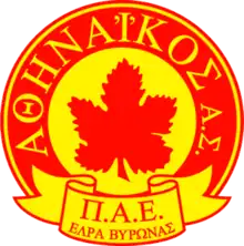 Athinaikos, officially known as Athinaikos AS FC (Greek: Αθηναϊκός Αθλητικός Σύλλογος - Athinaikos Athlitikos Syllogos), the Athenaic Athletic Association, is a Greek association football club based in the suburban town of Vyronas, located in the Athens agglomeration. The club is also referred to, unofficially, as Athinaikos Vyronas.