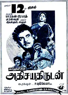 Athisaya Thirudan (transl. Crafty Thief) is 1958 Indian Tamil-language film directed by P. Pullaiah and produced by S. Bhavanarayanan and D. B. Narayanan. The film's script and lyrics was written by Thanjai N. Ramaiah Dass. Soundtrack was composed by S. Dakshinamurthi and K. Prasad Rao. The film stars Gemini Ganesan portraying the titular character, with Savitri, T. S. Balaiah, K. A. Thangavelu, T. P. Muthulakshmi and V. Nagayya in supporting roles.[1]