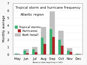 - ↑ Landsea, Chris. "Total and Average Number of Tropical Cylones by Month (1851-2017)". aoml.noaa.gov. National Oceanic and Atmospheric Administration, Atlantic Oceanographic and Meteorological Laboratory. Archived from the original on September 1, 2018.