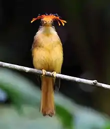 The Atlantic royal flycatcher is 16 to 16.5 cm (6.3 to 6.5 in) long. One specimen weighed 23.5 g (0.83 oz). This large-billed flycatcher has a spectacular, but rarely seen, crest. The upper parts are mostly dull brown with a bright cinnamon rump and tail. It has a whitish throat and ochraceous buff underparts. It has an erectile fan-shaped crest that when raised is scarlet, black, and blue in the male and yellow, black, and blue in the female.[6][7]