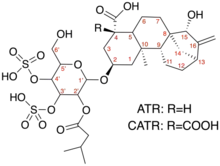A modified variant of the atractylenolide carries an additional carboxyl group at the C4 atom of the atractyligenin, which is then referred to as carboxy-atractyloside (CATR), sometimes referred to as "gummiferin".[9][10] The ATR/CATR chemical structure on the right indicates this difference between compounds.[11]