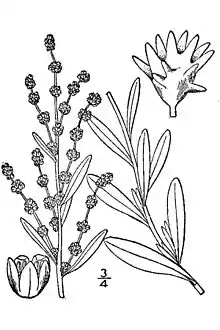 Leaves are sessile, elongated, rounded at the apex, opposite on the lower portions of stems, and alternate above. The bark is smooth, absorbent, and white. Leaf blades are densely scurfy and 7 to 18 millimetres (0.28 to 0.71 in) wide.[6]