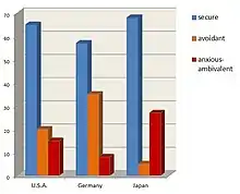 - A third group of problematic attachment is constituted by the types of insecure-avoidant and insecure-ambivalent attachment, both described by Mary Ainsworth, too. Children who are insecurely attached behave in the strange situation test either aloof towards their mothers, or they fluctuate between clinginess and rejection. As Beatrice Beebe (Columbia University) has substantiated in a study in 2010, these children experience from their mothers constantly behavior like under- or overstimulation, intrusiveness, or volatility. Nonetheless, their mothers displayed empathy and were fully able to respond to their children's emotional expressions appropriately; the children showed no signs of emotional distress.[107] Insecure attachment as defined by Ainsworth is very common and applies for example in the U. S. to about one out of three children.[109]