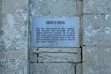 Auberge de Bavière is a large two-story building.[42] It has an austere façade[43] containing a centrepiece with the main doorway, above which is an open stone balcony. Six rectangular windows decorated with mouldings flank either side of the centrepiece.[39] The corners of the building have large pilasters, and a cornice runs along the entire building. A courtyard is located at the rear of the building, an unusual feature since at the time courtyards were usually placed at the centre.[6] During his visit to the island, Hoare observed that the coat-of-arms of England and Bavaria were attached on the façade of the building to supposedly symbolise the union.[17]