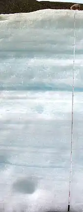 Aufeis (/ˈfs/ OW-fysse) (German for "ice on top") is a sheet-like mass of layered ice that forms from successive flows of ground or river water during freezing temperatures. This form of ice is also called overflow, icings,[1] or the Russian term, naled (Russian: наледь). The term "Aufeis" was first used in 1859 by Alexander von Middendorff following his observations of the phenomenon in northern Siberia.