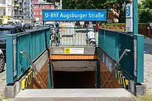 Augsburger Straße station was built in 1960/61 and opened on 8 May 1961, after the replacement of the Nürnberger Platz station by the new Spichernstraße interchange with the U9 line left too great a distance between stations for centre-city service. It is 491 m north of the Spichernstraße station and 615 m south of Wittenbergplatz.[1]