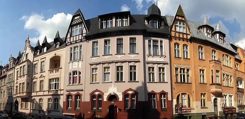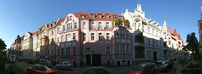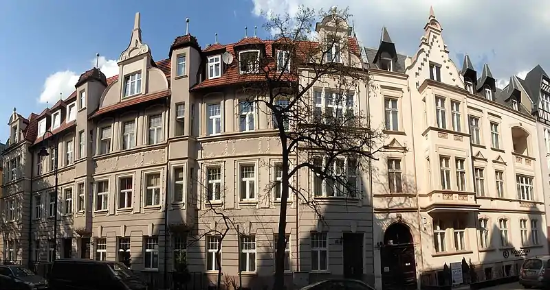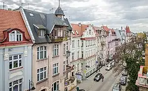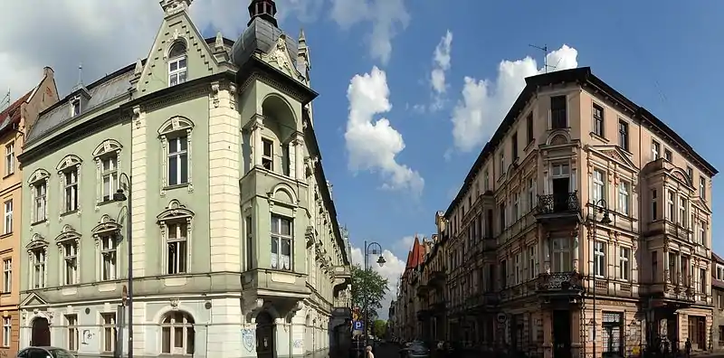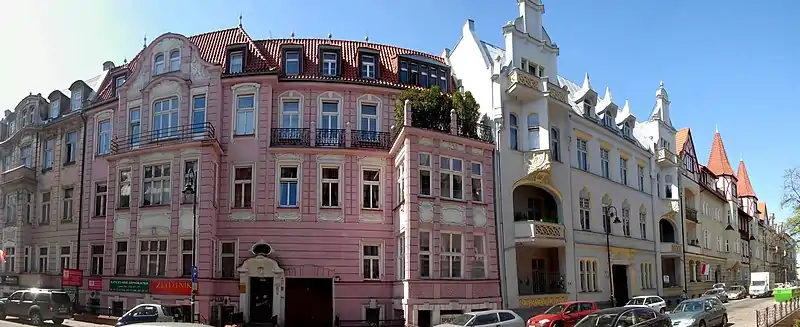 Oldest buildings are located at the intersections with Gdańska Street and Pomorska Street and display Eclecticism forms with details Neo-Renaissance and Neo-Baroque. In younger buildings, especially those erected after 1900, traditional stucco decorations on the facades are reduced to the benefit of enriching architectural forms. Buildings show asymmetrical facades, irregular shapes, with picturesque towers and merging bay windows. These forms are topped with magnificent gables, stressing the picturesque character. In all facades decoration appears stylized and simplified motives, in line with the new trends in art in the late 19th and early 20th century: acanthi, rococo details, Rose windows, herms and others.[4] Most developed sculptural allegorical decorations on houses facades are geometric and floral ornaments, initials, cartouche symbols and carved figural sculptures. The symbolism used generally refers to the house as a "home", a place of peace and rest, and points out the passing and contemplation of life.[4]