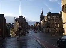 View along George IV Bridge, with Augustine United Church tower on the right