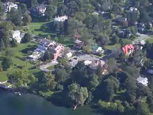 Aerial view of Aurora from south by southwest, 2013. The village is along the straight stretch of the Cayuga Lake shore just above lower right of photo.