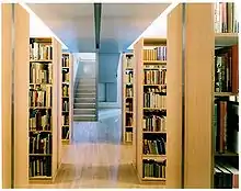 A competition was held in 1992 to choose a design for ACFNY's new building. Raimund Abraham was the winning architect among 226 submissions. Completed in 2002, the building is situated on a plot in Manhattan that is only 24.5 feet (7.5 m) wide[4] and 81 feet (25 m) deep.[5] It is considered as an architectural anomaly because, despite its small footprint, it is 24 stories and 275 feet (84 m) tall. The building's facade is clad in glass and aluminum and gradually tapers to a narrow point as it slants upwards in accordance with zoning laws.[5] It houses exhibition spaces, a theater, a library for books and audio recordings, offices, seminar and reception rooms, and apartments for the officers of the institution. The library is named in honor of Frederic Morton and has a collection of more than 10,000 books specific to Austrian art and culture.