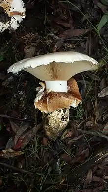 The fruitbodies of this fungus have convex to flattened caps with diameters typically in the range 5 to 7.5 cm (2.0 to 3.0 in),[11] although specimens up to 30 cm (12 in) have been noted.[12] There is no discernible odour.[3] The cap colour is whitish with brown tints, and ragged fragments of the partial veil often remain attached to the cap margin. The stipe is bulbous, with dimensions of 15 cm (5.9 in) long and 3.7–6.2 cm (1.5–2.4 in), although it is often much smaller than this. The gills on the cap underside have an initially adnate attachment to the stipe and pale straw colour; later, the gill attachment becomes sinuate to nearly free, and colour deepens to rusty brown as the spores mature.[11] The gills can be up to 1 cm (0.4 in) deep.[12] Remnants of a ring often persist on the stipe until maturity, as well as bits of the universal veil that once enclosed the immature mushroom.[11] The ring is often stained dark brown from the spores falling from the gills.[12] The ellipsoid to almond-shaped spores measure 10–13 by 5.4–6.9 µm,[11] and turn yellowish brown in KOH. Western Australian specimens have slightly larger spores, averaging 11.1 by 5.9 µm.[12]