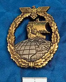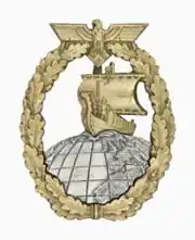 The Auxiliary Cruiser War Badge (German: Kriegsabzeichen für Hilfskreuzer) was a World War II German military decoration awarded to officers and men of the Kriegsmarine for service on Auxiliary Cruisers or the supply ships that supported them for a successful large voyage. The award was instituted on 24 April 1941 by Grand Admiral Erich Raeder.[1]