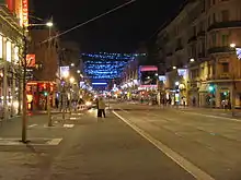 From 2003 to 2007, Avenue Jean Médecin was subjected to lengthy construction work both under and above ground to install the Nice tramway.[8] Since December 2008 it has been almost entirely a pedestrian street, the exception being the tramway.[8] At night, the center of the avenue is decked with thousands of blue diodes. They are a work of public art called L'amorse du bleu, by light artist Yann Kersalé, which was inaugurated on the occasion of the completion of the tramway.[11] The avenue is served by three tram stops for the T1 line, from north to south: Gare Thiers, Jean-Médecin, and Masséna, and one stop for the T2 line: Jean-Médecin.