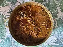Awara broth (Bouillon d'awara in French and Bouyon wara in Guianan Creole) is a typical Guianan Creole stew from French Guiana, made up of many ingredients that are combined with the pulp of the fruit of Awara tree, reduced at length beforehand in a pot. The stew can include salt ham, bacon, salt beef, pork snout, salt cod, smoked fish, fresh seafood like crabs and prawns, roasted chicken and vegetables like cabbage, spinach, eggplant and chile peppers.[1]