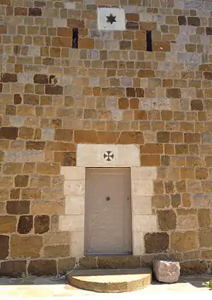 Three higher apertures can be seen on the western wall above the women's entrance: two rectangular narrow apertures and above them in the middle the third aperture made in white stone in the shape of a hexagram, a six-pointed star. The Women's door is encased into atypical heavy slabs of white limestone, and bears on the upper slab an unusual cross. The shape of the cross doesn't figure in the Maronite crosses tradition. It is a combination between a coptic cross and an Occitan cross. The Occitan cross is attributed to Raymond IV of Toulouse, whose family reigned in the county of Tripoli during the Crusades from 1109 till 1289 AD. Kfarsghab was administratively part of the county of Tripoli, which could be an explanation of the origin of this unusual cross.