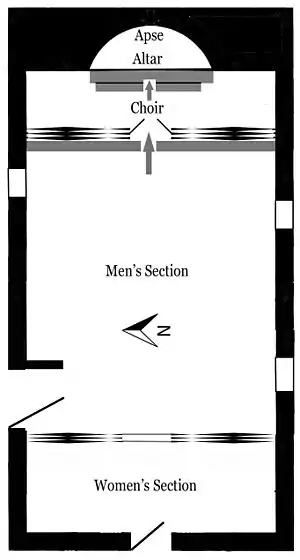 The Church layout is that of old small Maronite churches, with a single apse and a single nave typical of the 12th and 13th centuries Maronite churches.[7] The interior is divided according to Patriarch Estephan El Douaihy’s standard plan with minor differences due to the small size of the church.[8]