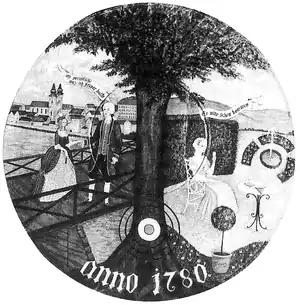 Schikaneder is known to history as the librettist and impresario of Mozart's opera The Magic Flute, written in 1791. In 1780, he had brought his theatrical trouple to Salzburg for an extended stay, and during this time befriended the Mozart family. He is recorded as participating in Bölzlschiessen with them, and the target that portrayed him was based on his reputation as a womanizer. According to Schroeder it shows him "trifling with one woman while another waits patiently for him to come to her."[10]
