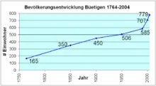 Büetigen has a population (as of December 2020) of 894.[8] As of 2010, 4.7% of the population are resident foreign nationals.[9] Over the last 10 years (2000-2010) the population has changed at a rate of 14.3%. Migration accounted for 10.3%, while births and deaths accounted for -0.4%.[10]
