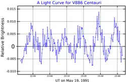 BPM 37093 (V886 Centauri) is a variable white dwarf star of the DAV, or ZZ Ceti, type, with a hydrogen atmosphere and an unusually high mass of approximately 1.1 times the Sun's. It is 48 light-years (15 parsecs) from Earth in the constellation Centaurus and vibrates; these pulsations cause its luminosity to vary.[3][5] Like other white dwarfs, BPM 37093 is thought to be composed primarily of carbon and oxygen, which are created by thermonuclear fusion of helium nuclei in the triple-alpha process.[8]