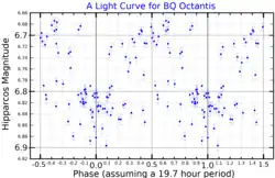 BQ Octantis is a variable star. An amplitude of 0.05 magnitudes about an apparent magnitude of 6.82 has been derived from Hipparcos satellite photometry. The same photometry found a possible period of 0.82 d but this was very uncertain and no variability type could be determined.[11] It is listed in the General Catalogue of Variable Stars as a possible slow irregular variable.[12] It was classified as a variable star in 1977,[13] on the basis of a 1960 study.[14] All Sky Automated Survey data shows a period of 48.1 days[3]