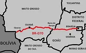 BR-070 is a federal highway of Brazil.[1] The 1315 kilometre road connects Brasilia to Porto Corixó, Cáceres, Mato Grosso.[2][3]