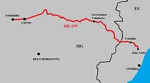 BR-259 is a federal highway in the southeastern Brazil. The road covers 711.7 km from Felixlândia, Minas Gerais to João Neiva, Espírito Santo.[1][2][3]