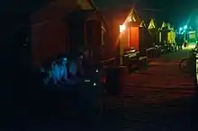 Often referred to as a "hooch", the B-Hut usually houses up to eight single persons, but can contain more if not broken down into separate rooms. It is cheaply made (US Gov't cost of about $15,000 each at time of construction)[1] of plywood and divided up into separate rooms with a common walkway down the center, or left open containing one large space. A typical B-hut has two entrances, two or three fluorescent lights on the ceiling, a small ductless air conditioning unit above each door. Each room usually has a window with a latch for ventilation and an electrical outlet for each occupant. B-huts afford no protection from indirect or direct fire and are often ridiculed by the service members and contractors who reside in them, but they offer limited privacy to the occupants by allowing them to have their own rooms.
