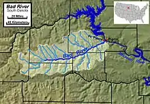 The Bad River (Lakota: wakpá-šiča;[1] "river-bad") is a tributary of the Missouri River, approximately 161 miles (259 km) long,[2] in central South Dakota in the United States. The river is formed at Philip, South Dakota, by the confluence of its North and South forks. The North Fork Bad River rises in eastern Pennington County and flows 51 miles (82 km)[2] east-southeast to Philip, while the South Fork Bad River rises at the confluence of Whitewater Creek and Big Buffalo Creek in Jackson County, within the Buffalo Gap National Grassland, and flows 36 miles (58 km) northeast to Philip.[2] The main stem of the Bad River flows east-northeast from Philip, passing Midland and Capa. It joins the Missouri at Fort Pierre. The Bad drainage basin is about 3,000 square miles (7,800 km2) and is located south of the Cheyenne River in the Pierre Hills and Southern Plateaus.[3]