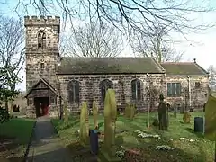 The parish church of Saint Chad is a Grade II listed building.[3] The current building was built in 1834 and was designed by J. Beardmore, with further alterations and refurbishments carried out in 1880. This church replaced an early church which was called Saint Michael which was established in the Middle Ages. This church is thought to have replaced an even earlier building which is thought to have Saxon origins. The present building stand on a hilltop. The church is constructed using coursed squared and rough dressed stone in a Gothic style. The footprint plan is of a rectangular shape. The bell tower and chancel were added in 1878.[4]