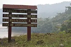 ![]() Signboard at the entrance of the buffer zone. Bahuaja Sonene National Park. | |