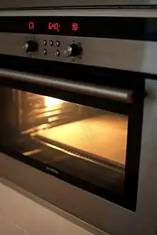 A baking stone is a portable cooking surface used in baking. It may be made of ceramic, stone or, more recently, salt.[1][2] Food is put on the stone, which is then placed in an oven, though sometimes the stone is heated first.[3] Baking stones are used much like cookie sheets, but may absorb additional moisture for crispier food.[4][5] A pizza stone is a baking stone designed for cooking pizza.