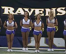 The Baltimore Ravens Cheerleaders are a cheerleading and dance squad for the Baltimore Ravens of the National Football League. Along with the Seattle Seahawks Dancers, the Tennessee Titans Cheerleaders and the Washington Commanders' Command Force, the Ravens squad is a co-ed squad, with the female cheerleaders doing various dance moves, and the males working on stunts, as in traditional cheerleading. The group was founded in 1998, and currently consists of 48 members (20 stunt team performers and 28 dancers).[1] The squad performs at the Ravens home stadium M&T Bank Stadium. The squad's director is Tina Galdieri, who cheered at the 1996 Summer Olympics in Atlanta, as well as the World League of American Football's (later NFL Europe) Barcelona Dragons, and also led the University of Maryland's cheerleading squad to a national championship in 1999.[2] The squad also has a "Lil Ravens" summer program, and unlike the other squads, boys also are permitted to join.[3] The group makes various appearances at parties and corporate functions throughout the year.[4] The female members of the squad also has a swimsuit calendar, with their 2012 calendar taking place in the Bahamas.[5] The squad currently has 31 female members.