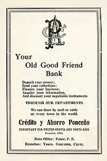 Banco Crédito y Ahorro Ponceño (Ponce Credit and Savings Bank) was the first bank in Ponce, Puerto Rico,[1] and one of the first two native Puerto Rican banks to be established in Puerto Rico.[2] The bank was the first one to introduce a bank credit card to the Puerto Rican market.[3] With over 50 branches throughout the island, the bank was one of the largest banking companies in Puerto Rico during most of the twentieth century.