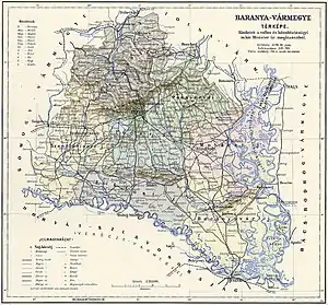 Baranya county was located in Baranya region. It shared borders with the Hungarian counties Somogy, Tolna, Bács-Bodrog and Verőce (the latter county was part of Croatia-Slavonia). The county stretched along the rivers Drava (north bank) and Danube (west bank), up to their confluence. Its area was 5,176 km2 around 1910.