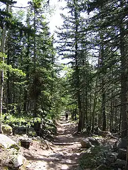 Barr Trail is a 13-mile (21 km) trail in the Pike National Forest that begins in Manitou Springs, Colorado and ends at the Pikes Peak summit.[1] The high elevation trail with a long sustained grade is rated more difficult by the U.S. Forest Service.[1] With a 7,800 feet (2,400 m) elevation gain to reach the summit, the Colorado Springs Convention & Visitors Bureau states that it is an advanced trail and is the most difficult trail in the Pikes Peak region.[2]
