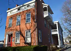 The three-story, three bay brick building in the Greek Revival style. It is on a raised basement and features brownstone trim and a third story Eastlake style porch.[2]