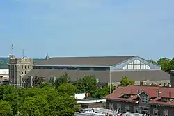 The New York State Drill Hall was designed by the official State Architect of New York, Lewis Pilcher.[2] It was built to provide military instruction to Cornell students, as required by Cornell's status as a land-grant institution.[2] Its drill shed originally contained 362 x 228 feet of open floor space, large enough to accommodate 1,000 men.[2] The building is made of local limestone with double trusses spaced 40 feet apart to support the roof.[2] The Architectural Record called the "splendid drill hall" a "notably modern achievement in American architecture."[2]