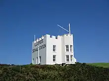 Before the advent of the telegraph, ships had no means of communication with their owners and could only send messages by semaphore when they were close to the shore. The telegraph reached Falmouth in 1857 and G. C. Fox & Company built a signal station at Bass Point with the intention of laying a telegraph cable from Falmouth. The Post Office intervened and the Lloyds Signal Station was opened on 1 April 1872. Initially communications between ship and shore were by flags and the messages were then sent to Helston by post or by horse rider. On 2 June 1872 a cable reached the signal station and the Post Office opened an office at the station. Night signals by coloured lights, gun, rocket and steam whistles began in November 1872 and William Broad & Sons of Falmouth opened an office next door. The companies combined their operations in 1875 and by 1877 over one hundred vessels a month were using the station.[2] It has been restored to recreate the original radio room and may be visited.[3]