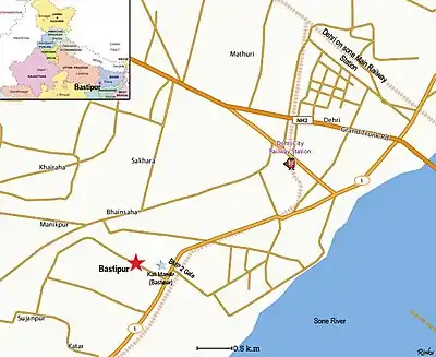 Bastipur (map) is near Dehri and Sasaram, in Bihar, India. This village is situated at the bank of the Sone River with an average elevation of 99 metres (324 feet) and is also surrounded partially by the Kaimur Range.