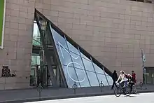 The three-storey Deconstructivist-styled rectangular building was designed by Moriyama & Teshima Architects, with Raymond Moriyama as the project's lead. Moriyama was inspired to shape the building like the boxes used to store and protect the Batas' footwear collection when he viewed them in 1978.[17] The three-storey building's roof is tilted, designed to appear as a lid sitting slightly askew atop a shoe box.[6][13] The building utilizes most of the property's area, due to local zoning by-laws restricting the height of the building to 13.4 metres (44 ft).[17] The building exterior is made out of smooth, angle canted limestone quarried from Lyons, France; and glass walls that protrude from the building's limestone facade, that serve as the entrance.[13][18] The building's exterior also features windows 13 metres (42 ft) above the ground.[6]