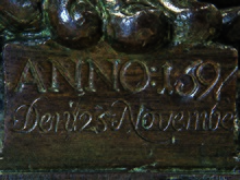 “(…) a 5 is usually produced in two or more different movements of the hand, beginning in the post Gothic period with a more or less vertical line followed by an angularly attached fragment of a circle toward the right that ends at the left without closing a circle as in the 6; a last movement can add a usually more or less horizontal line towards the right on top of the first vertical one”.[21] The 5 in the inscription is made like a handwritten 5. The German art-historian Dorothea Diemer has claimed since 1999 that the indication of the year in the caster's signature 1597 should be read as 1697.[22] Diemer's hypothesis is based on her interpretation of the 5, which she believes to have been originally a 6 on the casting model, which accidentally should have transformed itself during the casting process into a 5.[23]