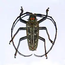 Batocera humeridens is a large flat-faced longhorn beetle reaching 45–60 millimetres (1.8–2.4 in) of length. The basic colour of the body is dark greyish with clearer greyish dorsal irregular spots on the elytra usually four on each elytron. Pronotum show two red depressions on both sides of the median line.