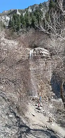 Battle Creek Falls is a waterfall on the west skirt of Mount Timpanogos east of Pleasant Grove, Utah.[3] Access to Battle Creek Falls is from the Battle Creek Trailhead off the Kiwanis Park picnic area.[2] The waterfall plunges into the rock at the base of the cliff without creating a pothole. The base of the waterfall has access directly from the trail.[4] Bridal Veil Falls is on the same mountain side, approximately 10 miles south for Battle Creek Falls.